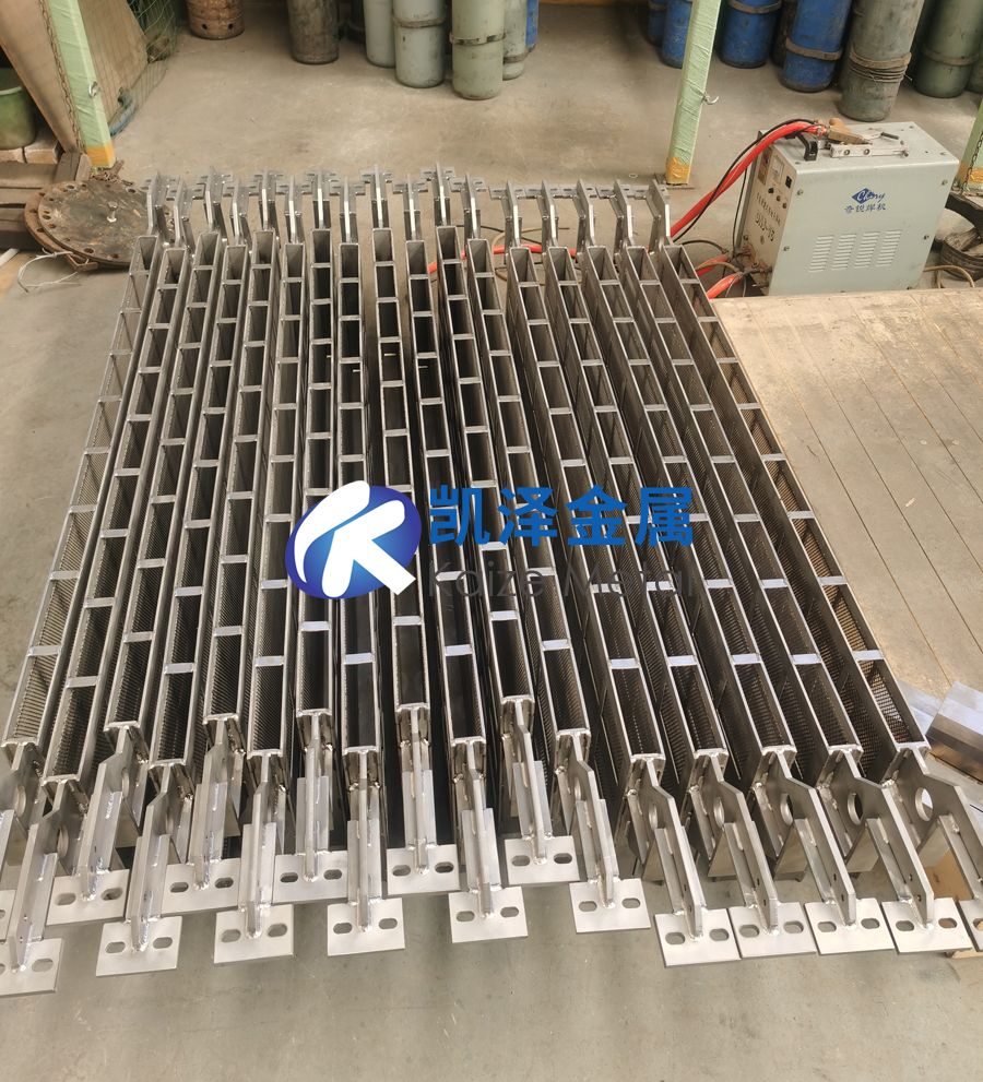 鈦籃由鈦框板和鈦網(wǎng)掛鉤三部分構成。